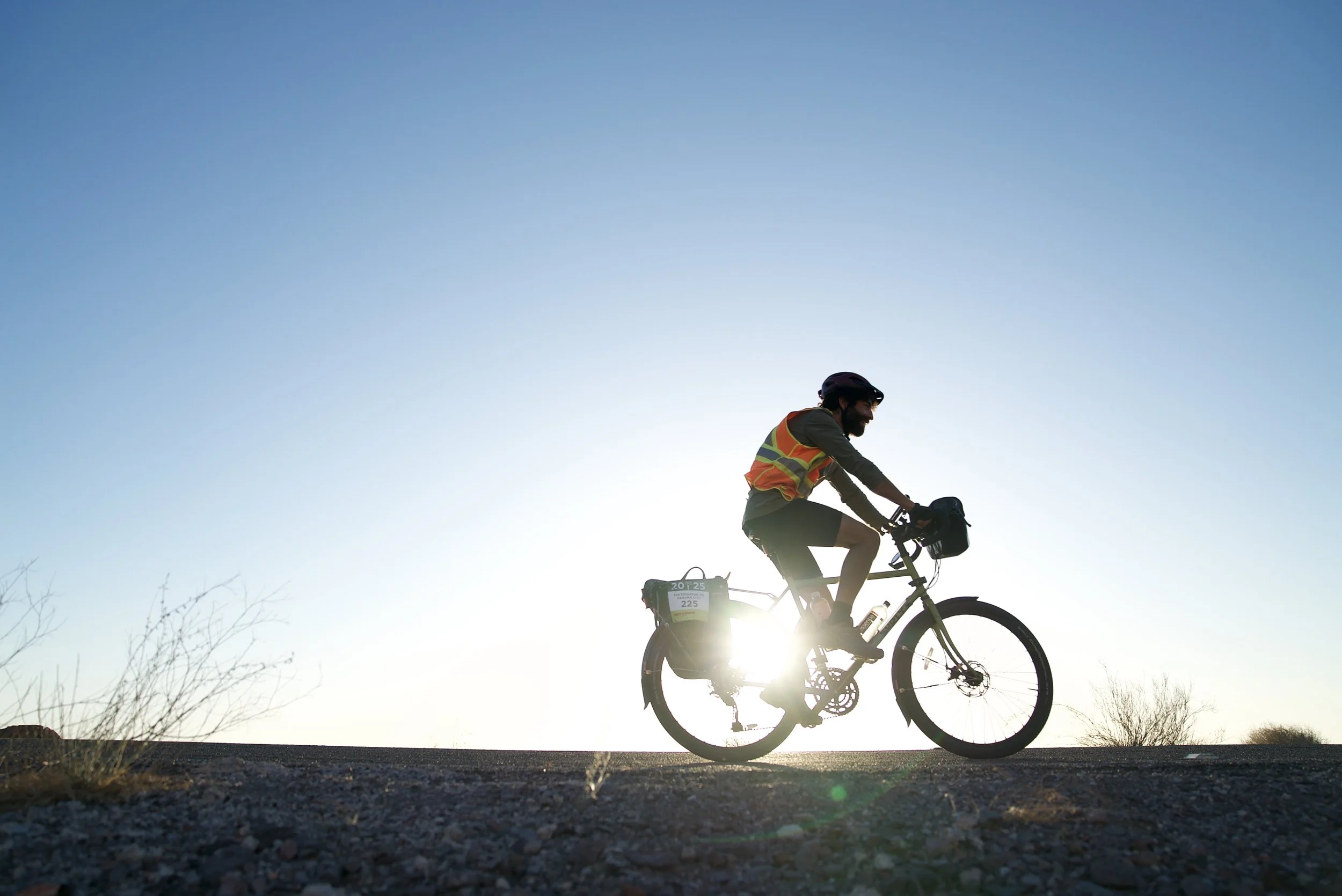 Jim Hodgkins rides through a field of cacti outside of Quartzsite, Arizona.JPG